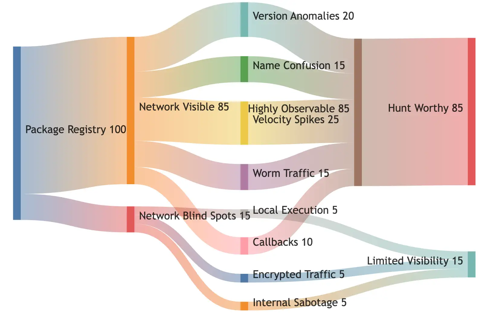 Reading the flow: This diagram reveals the hunting reality—85% of repository poisoning patterns leave observable traces in network traffic, creating opportunities for hunting. The remaining 15% hit blind spots where network monitoring fails, including local execution after package download, encrypted command-and-control channels, and insider sabotage, such as the Colors/Faker incident[5]. Your hunting effectiveness depends on understanding which patterns flow through observable channels and which require alternative telemetry sources, such as endpoint monitoring or code repository auditing.