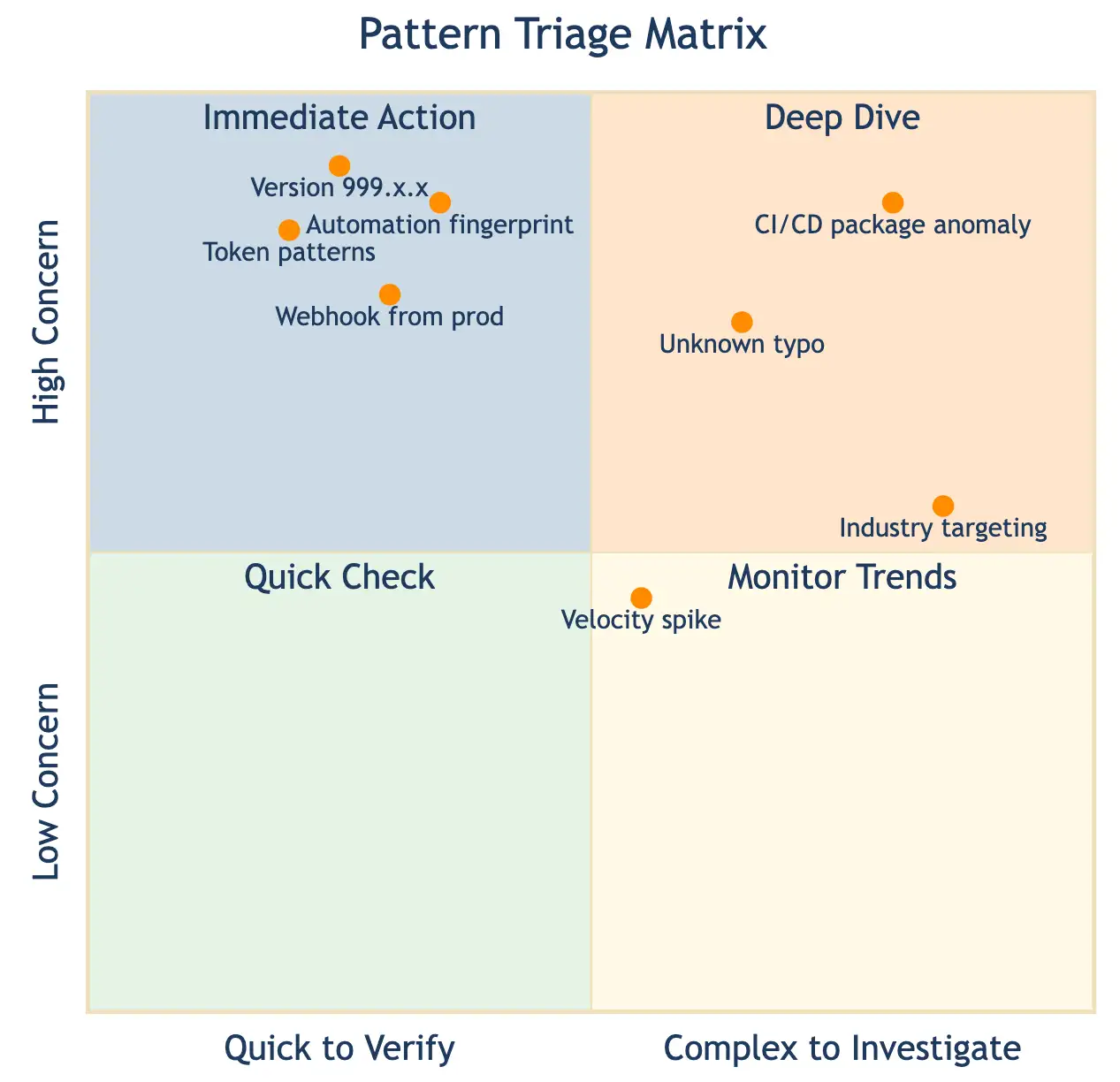 Many of the highest-risk patterns (like impossible version numbers, exposed tokens, automation footprints, or unexpected webhooks) end up in the Immediate Action area. Attackers can’t hide when these obvious signs appear, making quick triage possible. Other patterns require additional business or technical context (e.g., supply chain anomalies or new industry targeting), so they are assigned to quadrants that necessitate extra analysis. Utilizing these priorities helps prevent wasted effort and ensures prompt action for genuinely urgent threats.