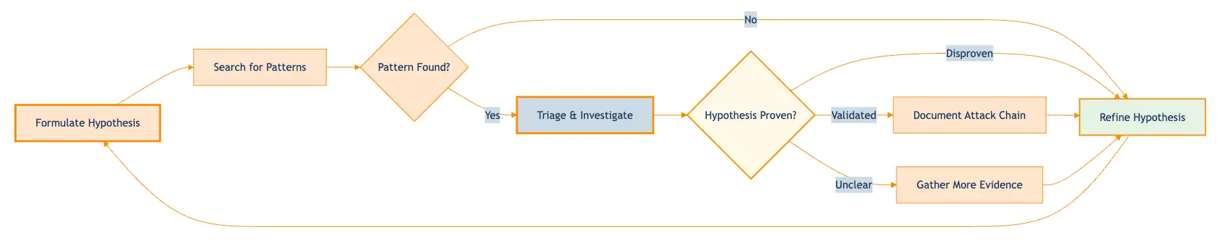 The simplicity of this loop is intentional—the complexity resides in the “Triage & Investigate” step, which varies based on the pattern detected and the context of your environment. That’s where the Hunt Decision Reference below becomes essential.