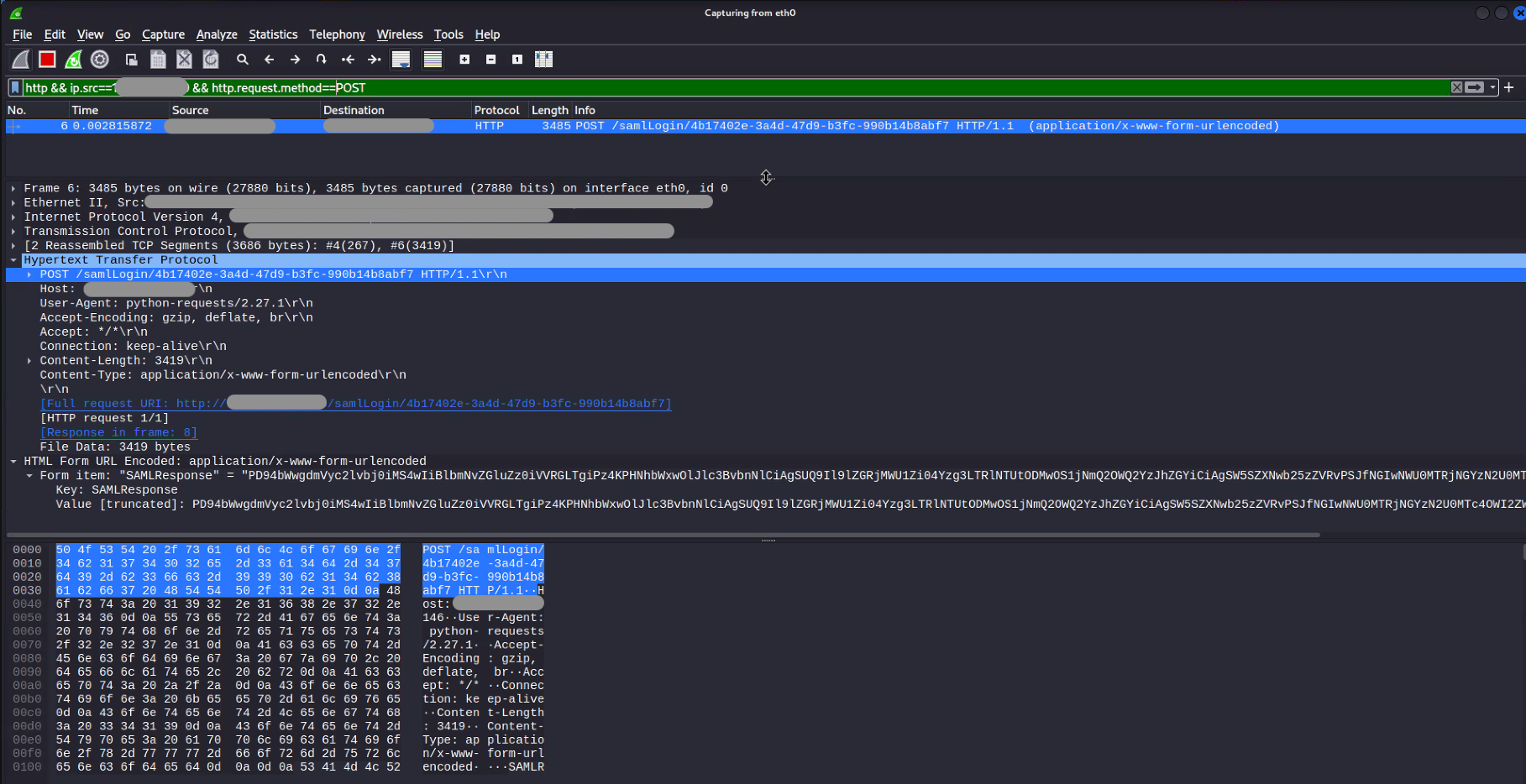 The following screenshots shows the HTTP POST request created from Horizon3’s PoC code, using the syntax variations shown above. Please note that this is a contextual demonstration of how the exploit code appears over the wire for detection and threat hunting development and may not be identical to observed exploitation in your environment.